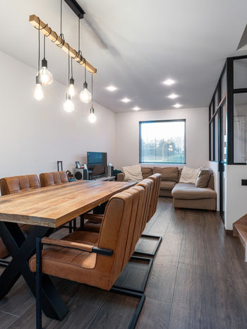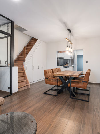 Van daaruit stap je verder de cozy woonkamer binnen, die naadloos overgaat in de eetkamer. Opbergruimte is er genoeg dankzij de op maat gemaakte kasten onder de trap.